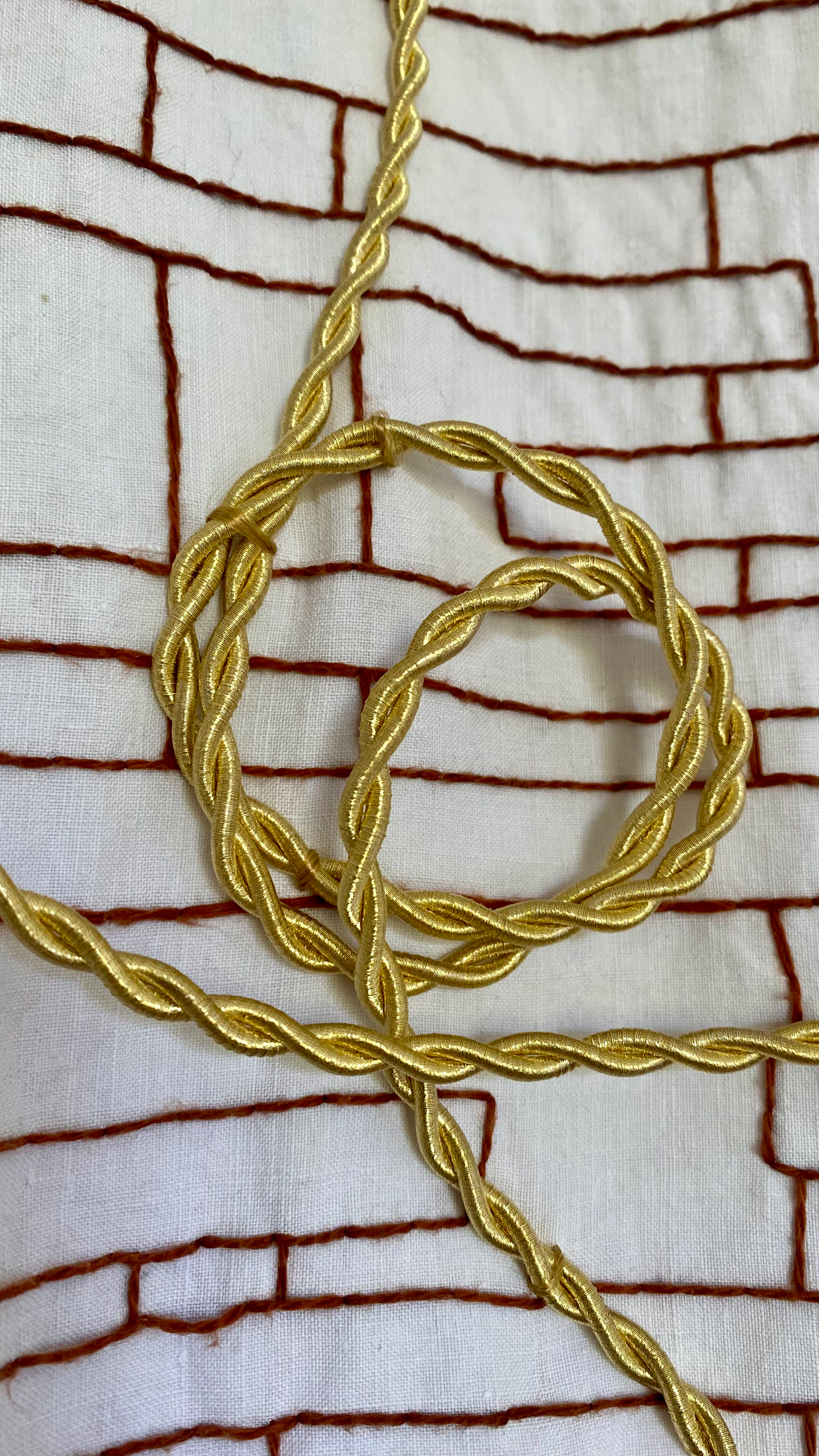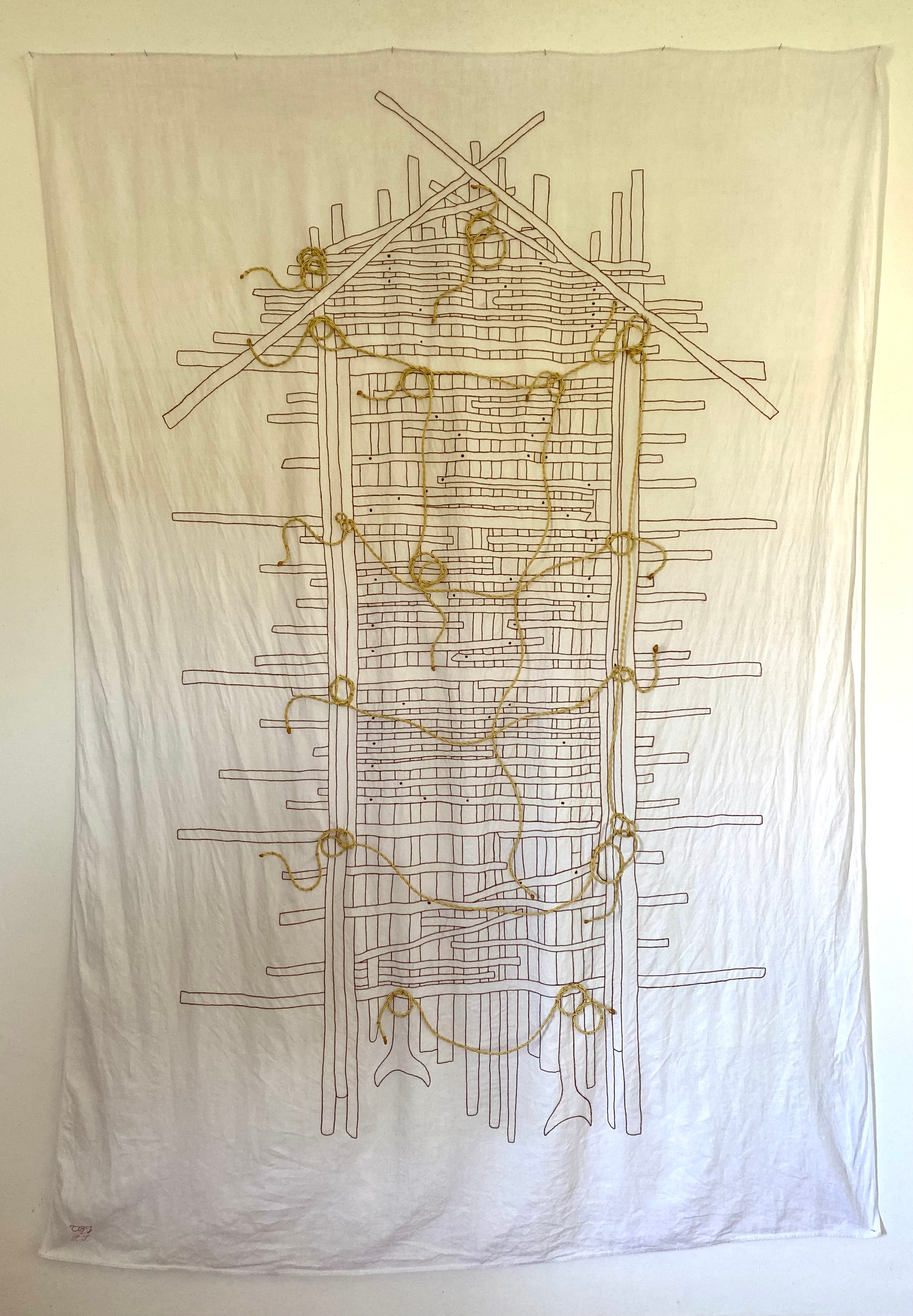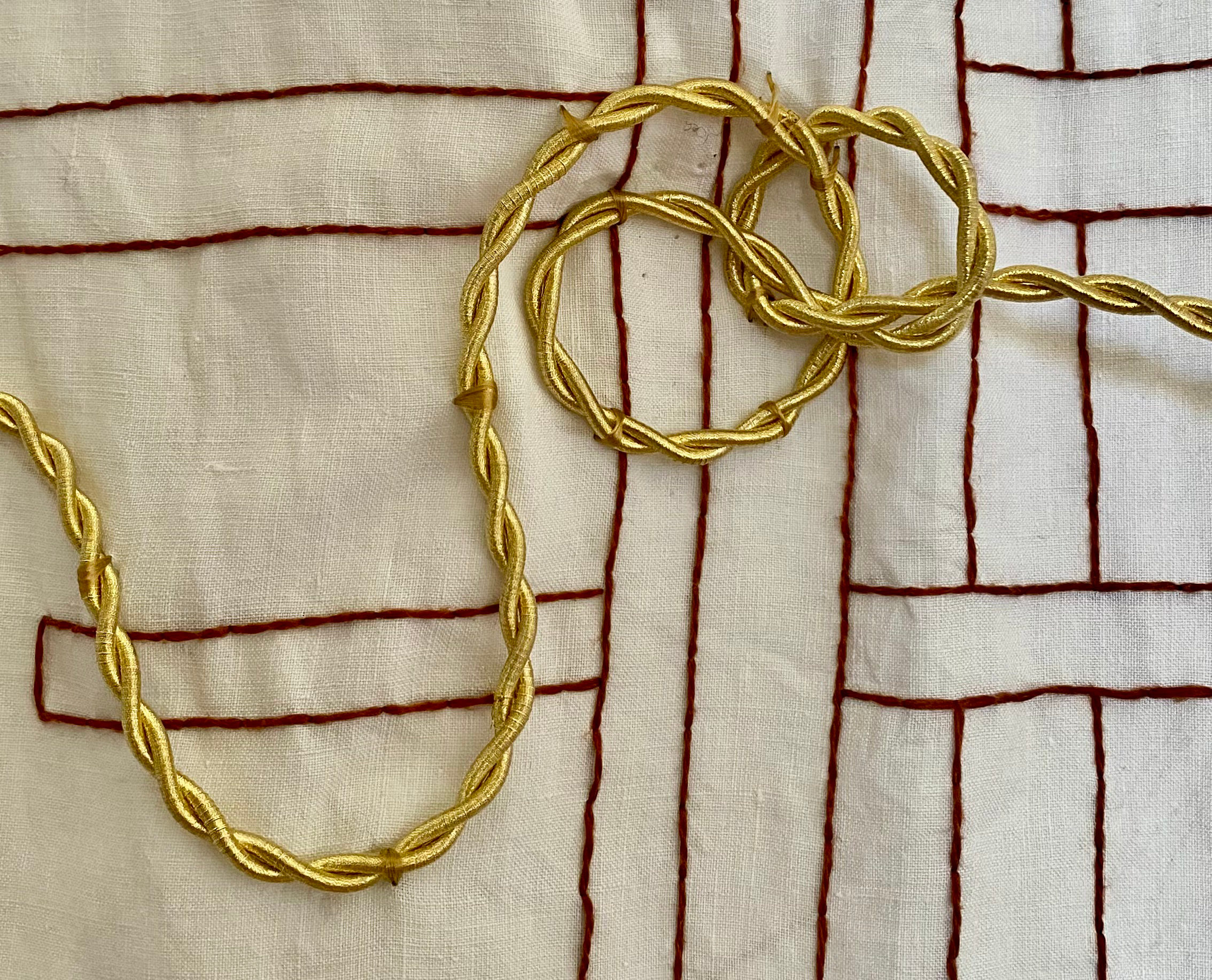 En una sábana heredada bordo el plano de La Balsa de la Medusa de Théodore Géricault, símbolo histórico del fracaso heroico y de la violencia institucional. En esta ocasión asocio esa imagen con la balsa con la que Ulises viaja a Ítaca de regreso. Usando cordón de oro, aplico nudos a modo de katadesmoi: conjuros de la Grecia antigua, en donde el acto de atar equivale a sellar un destino.